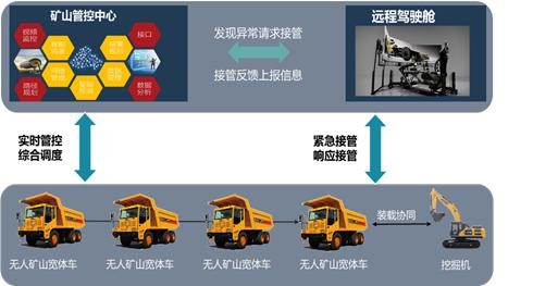 在大唐集團寶利主要驗證5G和無人駕駛的功能以及可靠性,參與作業(yè)生產(chǎn)的系統(tǒng)包括遠程駕駛、自動駕駛、機群管控,三個系統(tǒng)在不同階段參與車輛行駛作業(yè)和裝卸作業(yè)生產(chǎn)。遠程駕駛車端配備5G終端、高清攝像頭、車載控制器,當作業(yè)生產(chǎn)需要遠程駕駛系統(tǒng)時,主動向機群管控中心提出接管請求,機群管控中心通過5G網(wǎng)絡(luò)實現(xiàn)遠程控制。自動駕駛系統(tǒng)通過V2X、多種傳感器信息融合計算和決策實現(xiàn)超視距融合感知,結(jié)合車輛自身的定位和地圖信息進行決策規(guī)劃,進行自主作業(yè)。機群管控中心將路側(cè)感知的信息融合分析構(gòu)建虛擬環(huán)境模型,預(yù)測系統(tǒng)運行狀況;另外實現(xiàn)露天礦山挖掘機設(shè)備、運輸設(shè)備的協(xié)同生產(chǎn)場景進行實時監(jiān)控、調(diào)度作業(yè)和生產(chǎn)指揮。