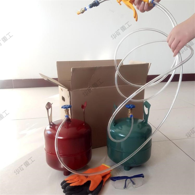 打開包裝取出罐體,充分搖晃使液體充分混合;將噴槍軟管與罐體閥門連接好并將罐體倒置;打開兩個罐體的閥門,手持噴槍進行噴涂(當(dāng)噴槍軟管不夠長時,可手提罐體把手,配合噴槍移動噴涂)。