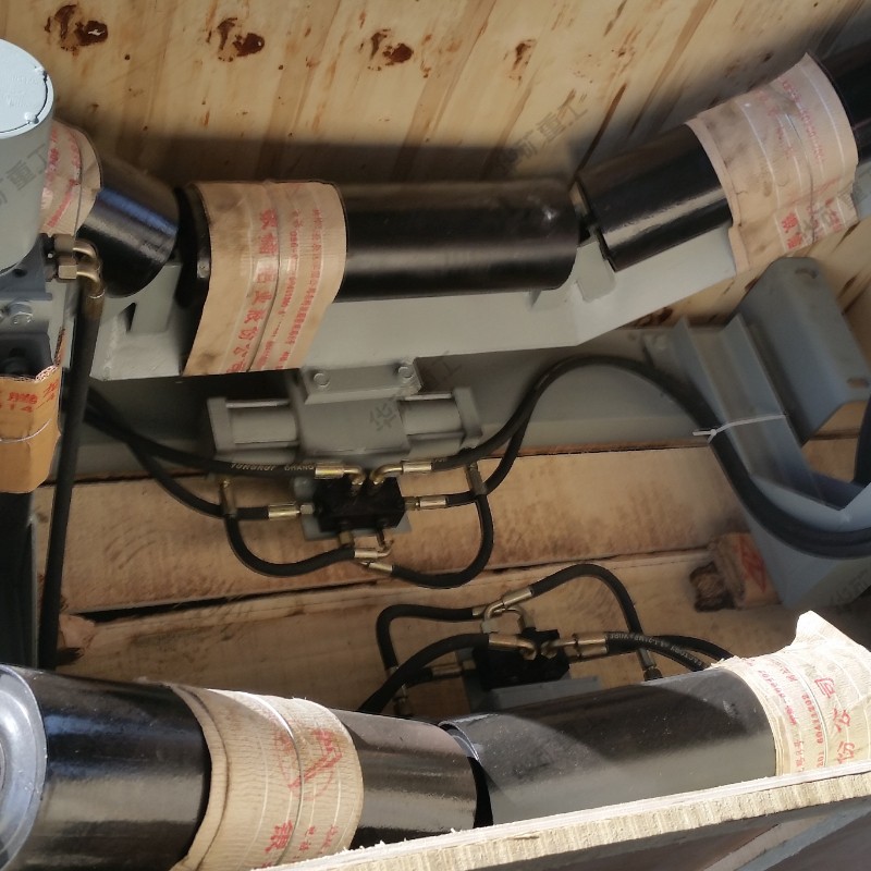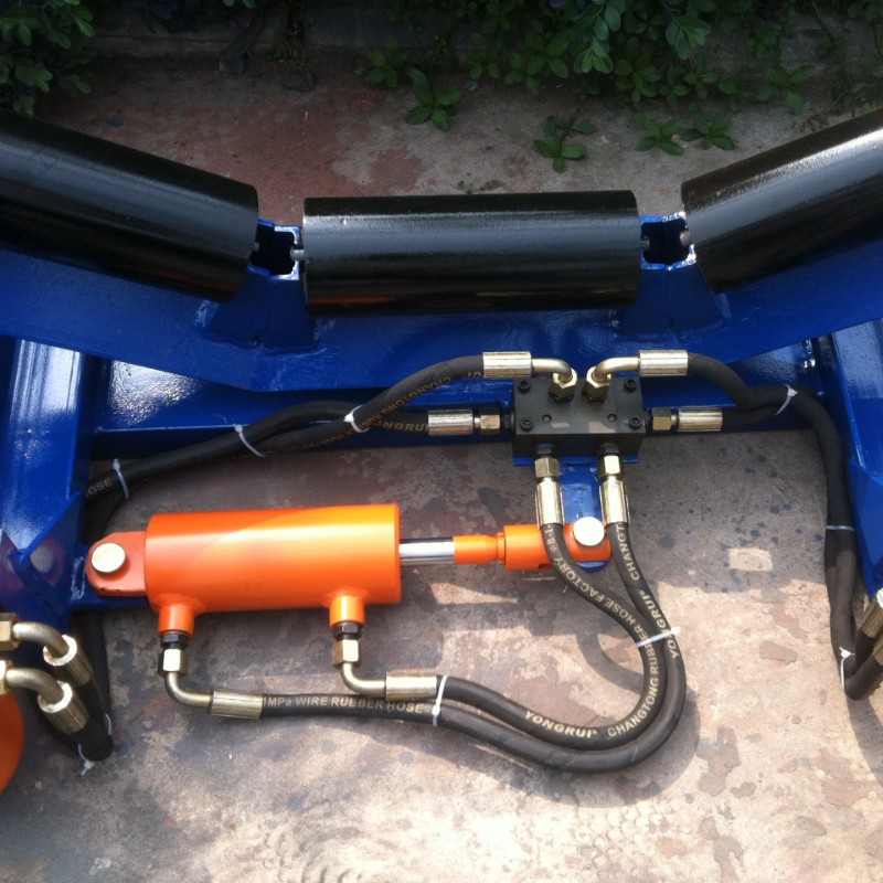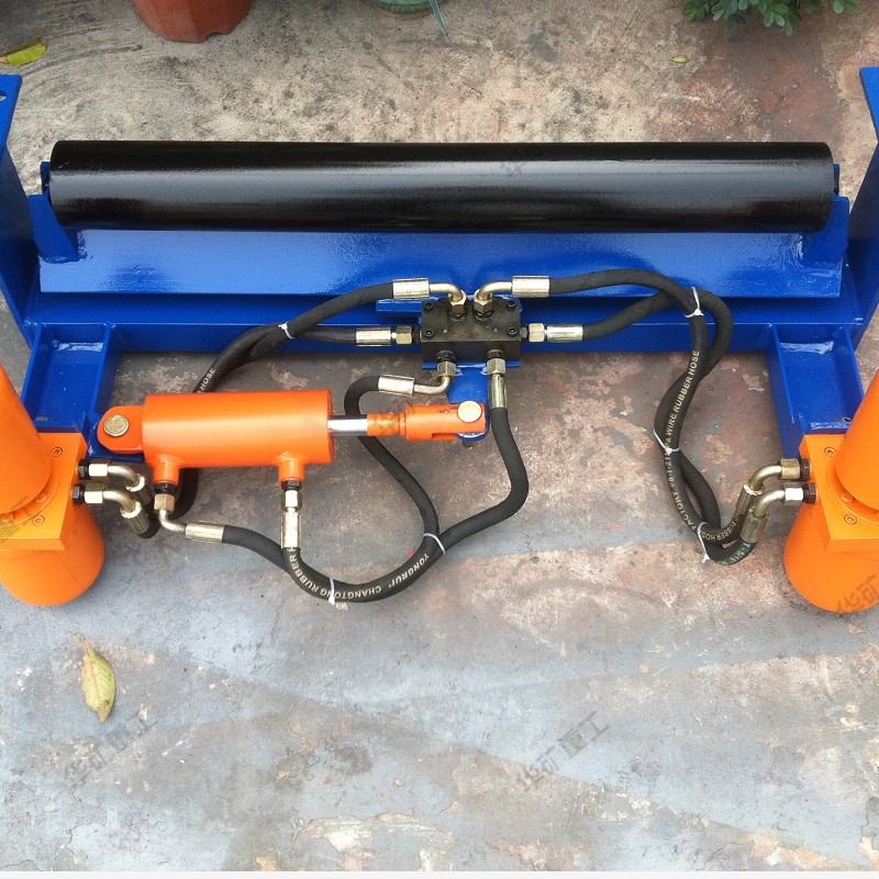 自動(dòng)液壓調(diào)偏裝置是由檢驅(qū)輪、油泵、復(fù)合油缸、油管、固定支架構(gòu)成。當(dāng)皮帶運(yùn)行跑偏時(shí),皮帶和檢驅(qū)輪接觸,檢驅(qū)輪帶動(dòng)油泵旋轉(zhuǎn),輸出液壓油控制驅(qū)動(dòng)油缸往復(fù)運(yùn)動(dòng),帶動(dòng)調(diào)心托輥偏轉(zhuǎn),使調(diào)心托輥的線運(yùn)動(dòng)方向與皮帶的運(yùn)動(dòng)方向形成一個(gè)夾角,產(chǎn)生的摩擦力驅(qū)動(dòng)皮帶,是皮帶始終在設(shè)定的范圍內(nèi)運(yùn)行,從而避免皮帶跑偏造散料、皮帶與皮帶機(jī)架摩擦撕帶,達(dá)到保護(hù)皮帶機(jī)正常運(yùn)行的目的。自動(dòng)液壓調(diào)偏裝置的核心部分為:一組液控?fù)Q向閥,它是由兩個(gè)液控?fù)Q向閥單體組成。每個(gè)液控?fù)Q向閥分別與一套檢驅(qū)輪泵組連接,兩個(gè)液控?fù)Q向閥共同控制一條油缸,來完成油缸的伸縮運(yùn)動(dòng),并且每個(gè)液控?fù)Q向閥之間互相影響,對(duì)油缸的控制迅速,準(zhǔn)確。產(chǎn)品屬性、結(jié)構(gòu)組成在機(jī)架上安裝一組調(diào)心托輥,在調(diào)心托輥的兩側(cè)相同高度垂直安裝兩只檢驅(qū)輪,檢驅(qū)輪轉(zhuǎn)軸與油泵的動(dòng)力輸入軸連接,分別把左右兩側(cè)的檢驅(qū)輪轉(zhuǎn)軸和油泵固定在機(jī)架上,調(diào)心托輥與左側(cè)固定支架之間設(shè)置復(fù)合油缸,復(fù)合油缸的尾部與固定支架鉸接,復(fù)合油缸的活塞桿與調(diào)心托輥的托輥架傳動(dòng)部分左側(cè)鉸接,用油管把油泵的油口與復(fù)合油缸缸尾部的油口接通。 當(dāng)皮帶跑偏時(shí),皮帶邊緣觸動(dòng)檢驅(qū)輪,而使油泵迅速輸出液壓油,通過油缸的油路集成塊進(jìn)入油缸,從而驅(qū)動(dòng)活塞桿迅速的伸出或縮回,拉動(dòng)調(diào)心桿托輥轉(zhuǎn)動(dòng),使皮帶居中。