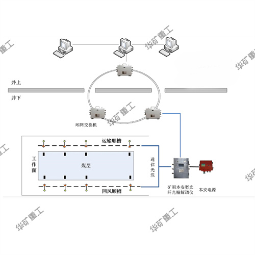 2、系統(tǒng)根據(jù)采場地質(zhì)條件采用了兩級總線設計,總線之間完全隔離,工作面和巷道數(shù)據(jù)無線采集傳輸。