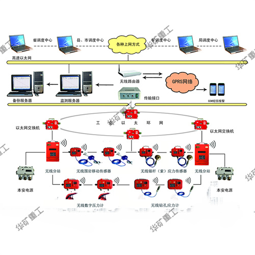 又叫做礦山壓力及頂板離層監(jiān)測系統(tǒng),主要用于實時、在線監(jiān)測液壓支架工作阻力、立柱伸縮量、超前支承壓力、煤柱應力、錨桿(索)載荷、巷道變形量及人員定位和管理等。