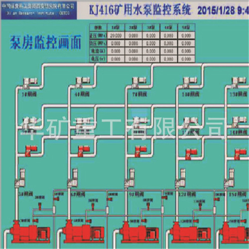 KJ416礦用水泵監(jiān)控系統(tǒng)是一套可對(duì)礦井水泵抽排水進(jìn)行集中監(jiān)控并能實(shí)現(xiàn)遠(yuǎn)程實(shí)時(shí)監(jiān)控的現(xiàn)代化控制系統(tǒng),該系統(tǒng)解決了現(xiàn)有礦井排水系統(tǒng)開泵程序繁瑣,發(fā)生透水事故時(shí)無(wú)人開啟備用水泵,系統(tǒng)故障以及排水效率低下等問(wèn)題。本系統(tǒng)通過(guò)各種先進(jìn)可靠的傳感器、保護(hù)器、電動(dòng)閘(球)閥、監(jiān)控電視等監(jiān)測(cè)煤礦井下排水系統(tǒng)各設(shè)備的工作狀態(tài),實(shí)現(xiàn)井下水位、水壓、水泵排水系統(tǒng)的自動(dòng)監(jiān)控,及時(shí)發(fā)現(xiàn)系統(tǒng)存在的隱患與故障點(diǎn)。此外,將監(jiān)測(cè)到的數(shù)據(jù)實(shí)時(shí)通過(guò)光纖上傳至地面上位系統(tǒng)可方便實(shí)現(xiàn)井下泵房遠(yuǎn)程控制。該系統(tǒng)與KJ117礦井水文監(jiān)測(cè)系統(tǒng)的聯(lián)動(dòng),可以實(shí)時(shí)監(jiān)控礦井上下水文觀測(cè)孔水壓、水溫、流量以及采空區(qū)水位,排水明渠等水文參數(shù),通過(guò)多種傳感器的實(shí)時(shí)監(jiān)測(cè)可實(shí)現(xiàn)對(duì)煤礦透水事故的預(yù)警,事故通過(guò)井下光纜將數(shù)據(jù)傳輸至生產(chǎn)調(diào)度中心監(jiān)控平臺(tái),系統(tǒng)預(yù)留井下通訊接口,并以指揮井下人員在發(fā)生透水事故時(shí)的緊急撤離,為及時(shí)啟動(dòng)礦井水災(zāi)應(yīng)急救援和最大限度地保證煤礦安全生產(chǎn)提供可靠技術(shù)手段。
